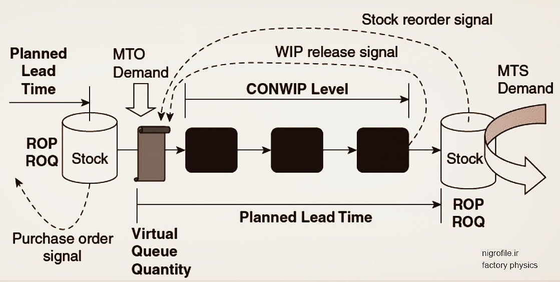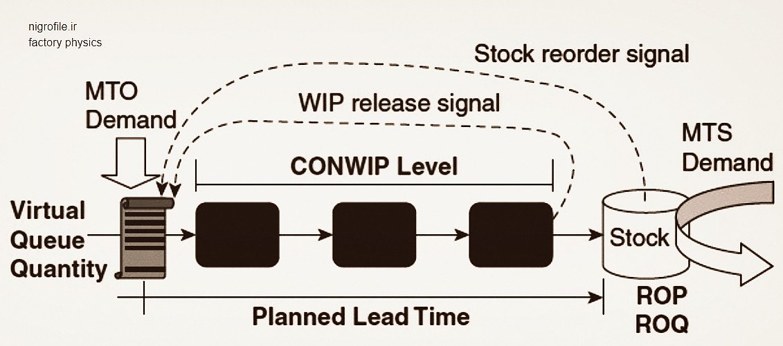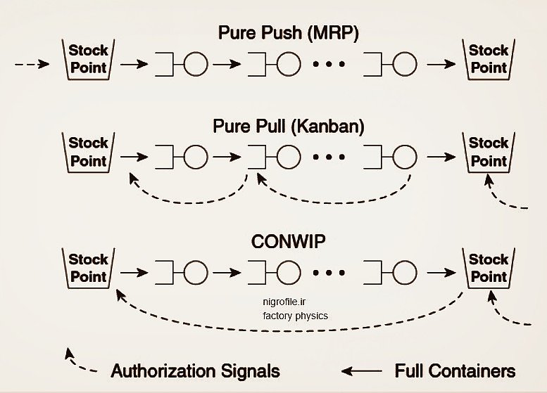 رویکردی ساده تر که در اصطلاح CONWIP نامیده می شود نیز مکانیسم کنترل WIP اما ساده و کاربردی تر از کانبان است که البته همان مزایای اجرای یک سیستم کششی را دارد. اینجا وقتی کار تولید محصول مشخصی به انتهای خط (معمولاً ایستگاه مونتاژ نهایی) رسید، فرمان صدور شروع تولید محصول بعدی که به نقطه سفارش رسیده است صادر می شود. شکل (۵) شکل شماتیک هر یک از سه مکانیسم کنترلWIP توصیف شده را نشان می دهد.