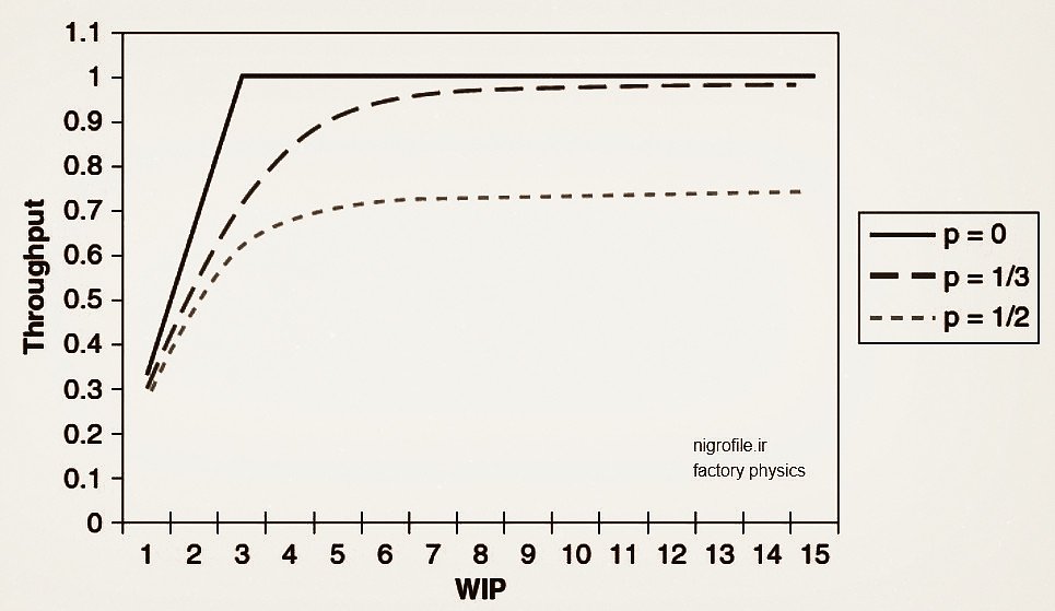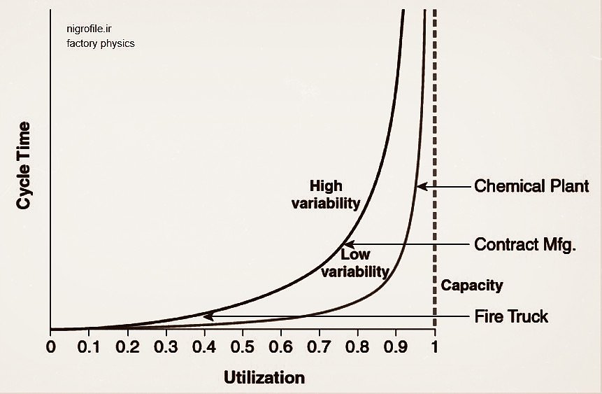 از مباحث گذشته (معادله کینگمن) می دانیم که افزایش در نرخ بهره برداری منجر به افزایش نمایی زمان سیکل تولید خواهد شد و در برخی مواقع سیستم تولیدی منفجر می شود. این همان دلیلی است که مخالف نظر صاحبان کسب و کار است که دلشان می خواهد ماشین آلات و کارکنان همیشه مشغول فعالیت باشند.