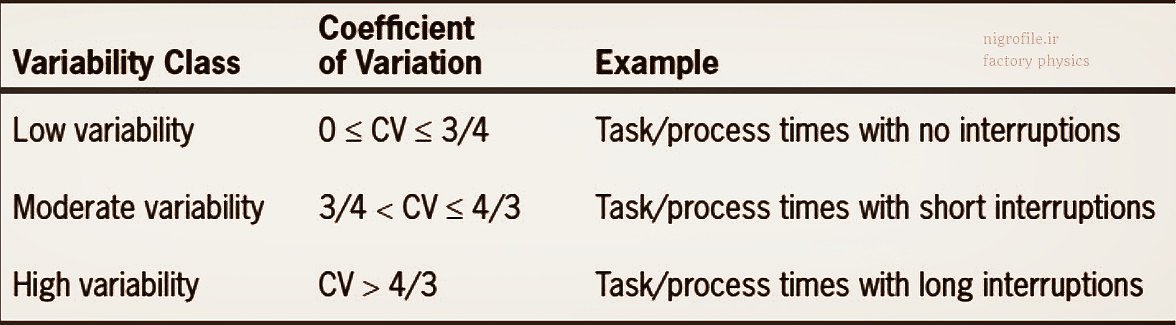 به همین ترتیب، واریانس (σ۲) یا (σe۲) است. در نهایت، مجذور ضریب تغییرات (Squared Coefficient of Variation) برای مشخص کردن تصادفی بودن زمانهای فرآیند مؤثر محاسبه میشود. همانطور که در جدول (۱) نشان داده شده است، نوسانات را بر اساس CV به سه گروه تقسیم می کنیم.