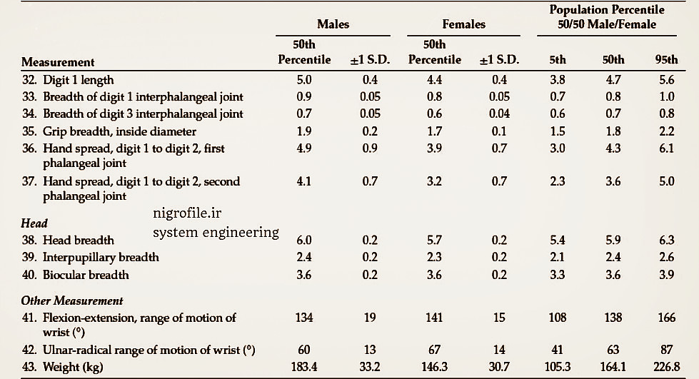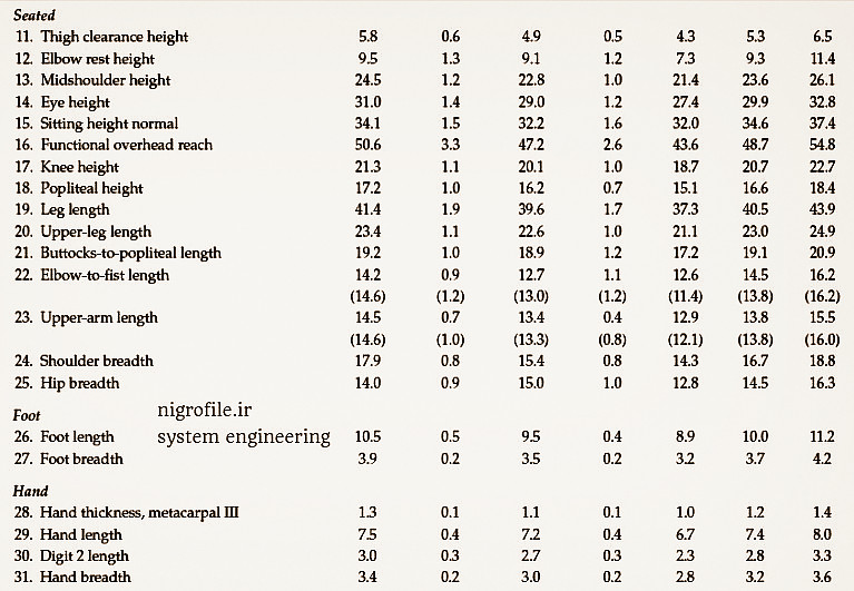 جدول ۱- داده های آنتروپومتری ( کلیه ارقام بدون واحد به اینچ است)