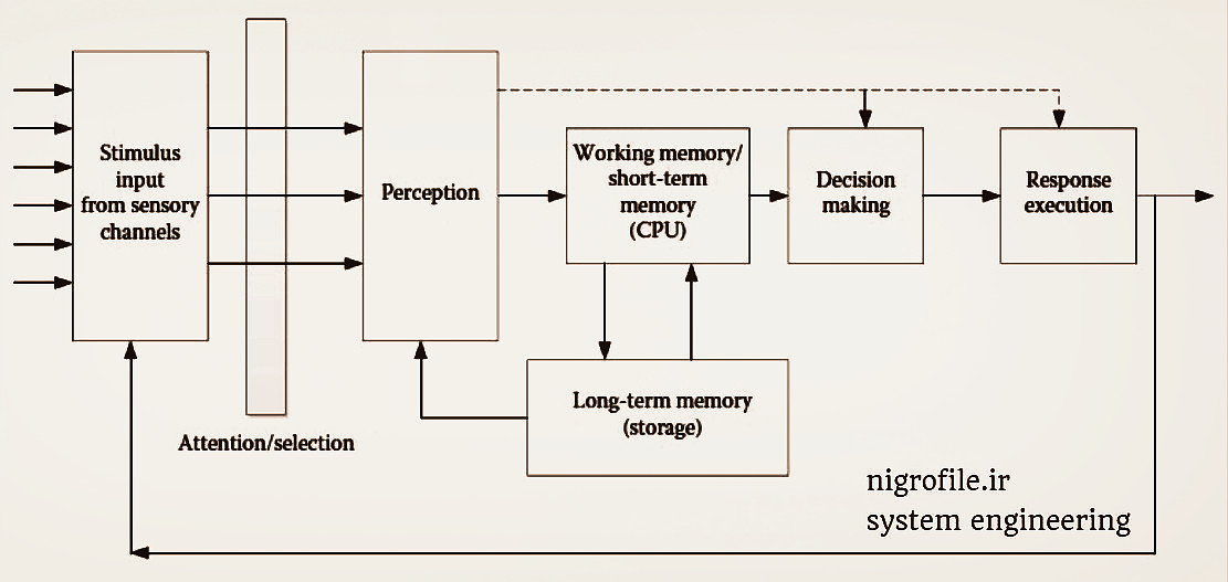 ۳- ادراکی (Cognition)؛ هدف در اینجا شناخت مکانیسمهای است که انسان از طریق آن پدیده های اطراف خود را درک کرده، راجع به آنها فکر میکند و به یاد میآورد. تمرکز روی مدل های رواشناسی است که بتواند این فرآیند را به خوبی توصیف کند. برای مثال یک مدل از پردازش اطلاعات در شکل (۱) نشان داده شده است.