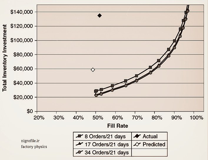 شکل (۵) یک نمودار عملکرد و مرز کارآیی را برای یک تولید کننده نشان می دهد. محور افقی نرخ تکمیل سفارش (Fill Rate) و محور عمودی نیز سرمایه لازم برای خرید یا ساخت موجودی مورد نظر را نشان می دهد. سه منحنی مشخص شده تعداد سفارشات را برای ۱۱ قلم کالا در طی ۲۱ روز کاری در طی ماه نشان می دهد.