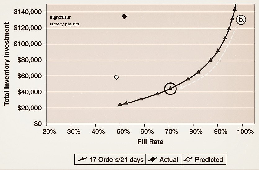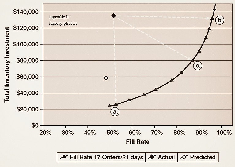 به عنوان مثال، شکل (۷) نشان می دهد که حرکت از نقطه b روی منحنی به نقطه ای با نرخ تکمیل سفارشات برابر ۷۱ درصد، سرمایه گذاری موجودی مورد نیاز را به ۴۳۷۱۲ دلار کاهش می دهد، یک کاهش ۶۷ درصدی. اما این بدان معناست که موجودی در ۲۹ درصد مواقعی که تقاضا رخ می دهد در دسترس نخواهد بود لذا این یک سیاست در سطح عالی محسوب نمی شود.