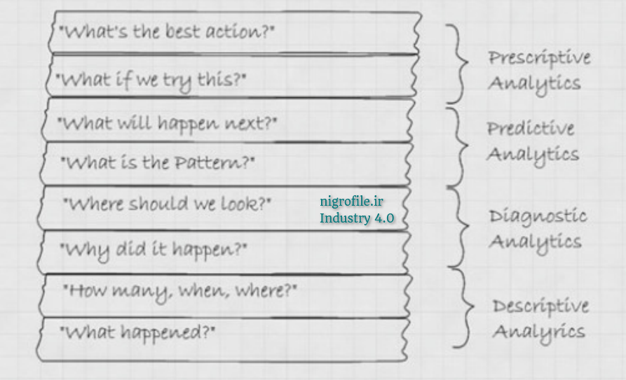در نهایت در بالاترین لایه، الگوریتم های داده کاوی هستند که وظیفه تبدیل این داده ها به اطلاعات و تقطیر این اطلاعات به دانش مورد نیاز را برعهده دارند. همانطور که در شکل (۳) مشاهده می کنید، طیفی از الگوریتم ها مورد نیاز است. بعد از اینهمه سرمایه گذاری و چالش های فنی قرار نیست در پایان الگوریتم ها بگویند چه اتفاقی در کجا رخ داده بلکه انتظار می رود که بتوانند پیش بینی کنند که چه زمانی در آینده تکرار خواهد شد و راه حل های تجویزی ارائه دهند. تصمیم گیری بر پایه این راه حل های قابل اتکاء، ریسک را کاهش و احتمال موفقیت را افزایش خواهد داد.