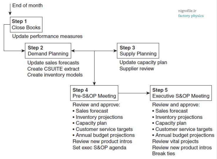 توالی S&OP رویدادها در شکل (۱) نشان داده شده است. مدیر فرآیند S&OP مسئول زمانبندی فعالیتهای S&OP در طول ماه، هماهنگی جلسات، ارائه دستور کار جلسه، و پیگیری موارد اجرایی است. نکته مهم در موفقیت اینگونه جلسات حمایت مقام ارشد سازمان می باشد به طوریکه اگر این حمایت کمرنگ باشد از اثرگذاری فعالیت ها هم کاسته خواهد شد.