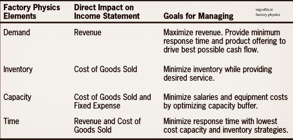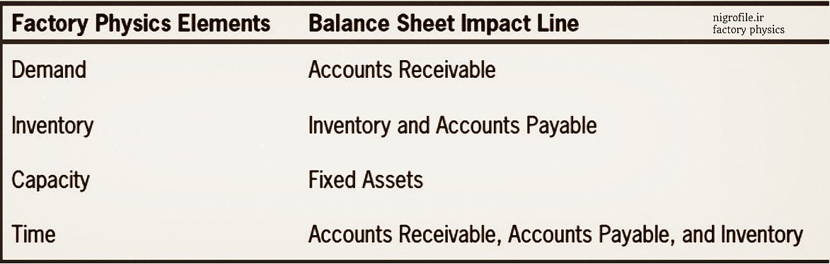 هدف نهایی برای هر کسب و کاری سود و جریان نقدی است. رویکردهای گفته شده از تئوری فیزیک کارخانه تأثیر مستقیمی بر سود و جریان نقدی دارد، همانطور که در صورتهای مالی سنتی منعکس شده است.