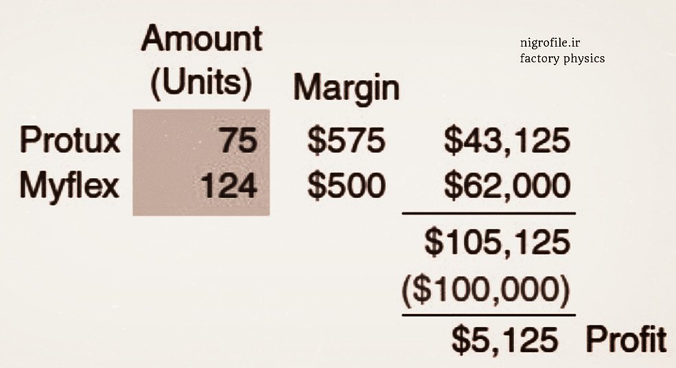 این یک نتیجه قابل توجه است. اگر شرکت بخواهد بیشترین پول نقد ممکن را کسب کند، حداقل مقدار مجاز Protux را که توسط واحد بازاریابی و فروش مشخص شده را تولید کند و تمام ظرفیت باقیمانده را به Myflex اختصاص دهد. نتیجه این استراتژی در شکل (۵) نشان داده شده است. در اینحالت شرکت سود می کند.