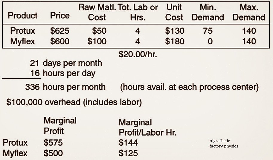 اکنون مثال عملیاتی تر یک شرکت داروسازی با دو محصول Protux و Myflex را در نظر بگیرید. مسیر تولید هر دو محصول در شکل (۲) نشان داده شده است. یک واحد Protux به ۲ ساعت زمان پردازش در مرکز فرآیند A و ۲ ساعت در مرکز پردازش C نیاز دارد. یک واحد Myflex به ۲.۵ ساعت زمان پردازش در مرکز فرآیند B و ۱.۵ ساعت در مرکز فرآیند C نیاز دارد.