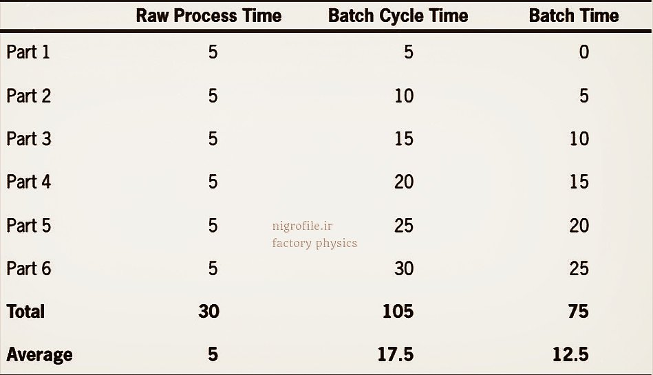 دو جزء اصلی، زمان تولید دسته ای و زمان صف (انتظار) هستند. قبلاً در مورد زمان صف صحبت کرده ایم. زمان فرآیند خام میانگین زمانی است که یک دسته تولیدی از ابتدا تا انتهای خط را طی می کند. تعداد قطعه یا محصولی که در هر دسته انتخاب می شود (Batch Size) بر زمان فرآیند و همچنین زمان انتظار تأثیر مستقیم دارد.