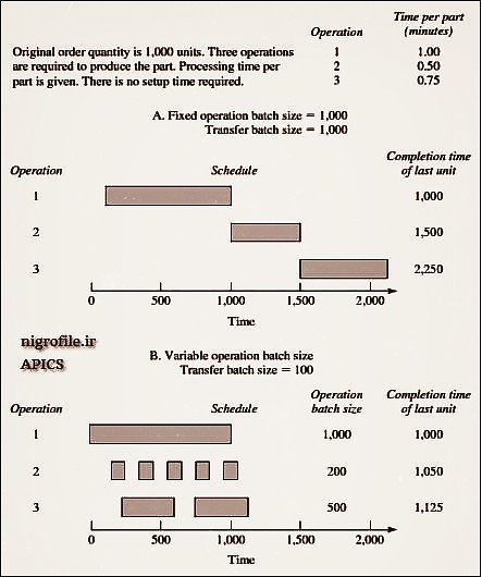 فرض کنید سفارش ماه جاری (دوره برنامه ریزی) از محصولی برابر ۱۰۰۰ واحد است و برای تولید این محصول نیاز به ۳ مرحله فرآیند داریم. یک راه این است که هر ۱۰۰۰ واحد از محصول یکجا اول در ایستگاه کاری اول پردازش کنیم بعد از تکمیل این مرحله دوباره کل سفارش را به ایستگاه دوم و سوم منتقل و عملیات تولید را ادامه دهیم، در اینجا اندازه دسته تولیدی و دسته انتقالی یکسان و برابر ۱۰۰۰ واحد است.