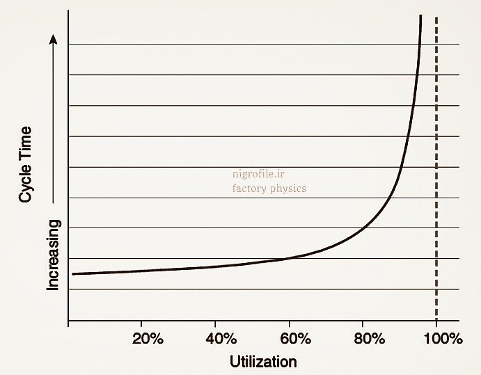 در اینصورت چه اتفاقی برای زمان سیکل تولید می افتد؟ قطعا با توجه به شکل زمان سیکل منفجر می شود. نتیجه اینکه زمان سیکل تولید به تغییرات کوچک در توان عملیاتی در سطوح بالای نرخ بهره برداری (از ماشین آلات) بسیار حساس است.