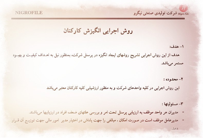 هدف از این روش اجرایی تشریح روشهای ایجاد انگیزه در پرسنل شرکت، بمنظور نیل به اهداف کیفیت و بهبود مستمر میباشد. در این نمونه روش اجرایی نحوه محاسبه و اجرای یک سیستم آکورد و پاداش به کارکنان تشریح شده است. همراه با این روش اجرایی سه فرم مرتبط شامل فرم ارزیابی رضایت کارکنان، فرم ارائه پیشنهاد و پاسخ به پیشنهادات ارائه شده است.