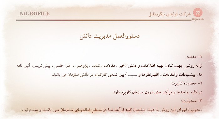 هدف از نمونه دستورالعمل مدیریت دانش، ارائه روشی جهت تبادل بهینه اطلاعات و دانش (خبر ، مقالات ، کتاب ، پژوهش ، متن علمی ، پیش نویس، آئین نامه ها ، پیشنهادات وانتقادات ، اظهارنظرها و ……… ) بین تمامی کارکنان در سازمان می باشد.
