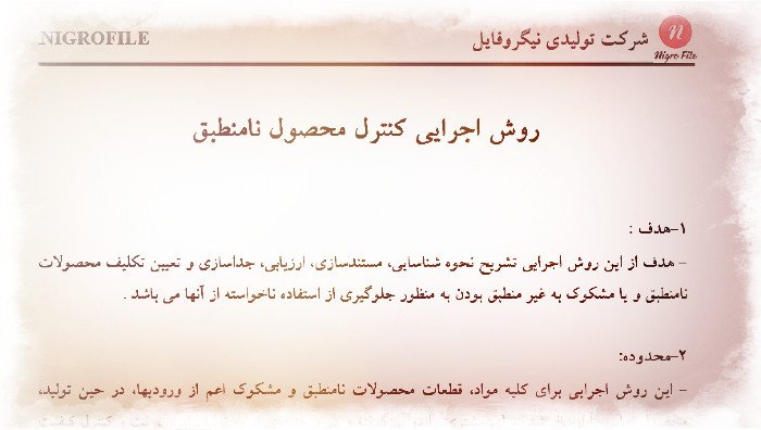 هدف از نمونه روش اجرایی کنترل محصول نامنطبق، تشریح نحوه شناسایی، مستندسازی، ارزیابی، جداسازی و تعیین تکلیف محصولات نامنطبق و یا مشکوک به غیر منطبق بودن به منظور جلوگیری از استفاده ناخواسته از آنها است. به همراه این روش اجرایی فرم های ذیل پیوست می باشد: