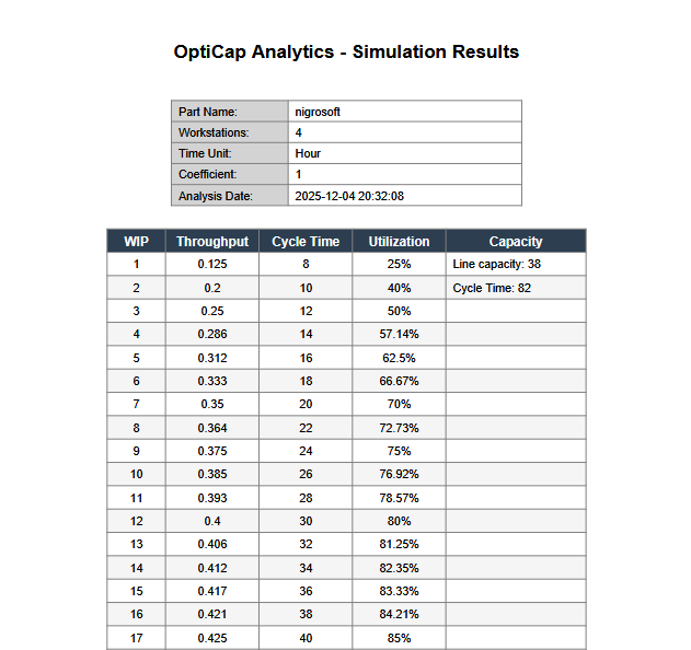 توجه داشته باشید که اطلاعات مربوط به ستون ظرفیت (Capacity) که شامل ظرفیت خط و زمان سیکل است معادل آخرین ردیف در پنجره خروجی است که برای درک سریعتر در یک ستون مجزا آمده است.
