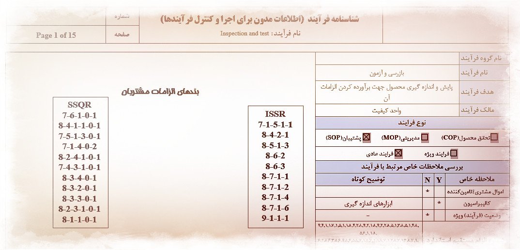 ۵- نمونه شناسنامه فرآیند برای بازرسی و آزمون کیفیت
