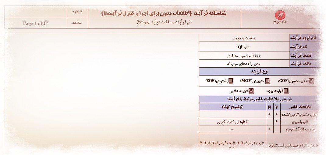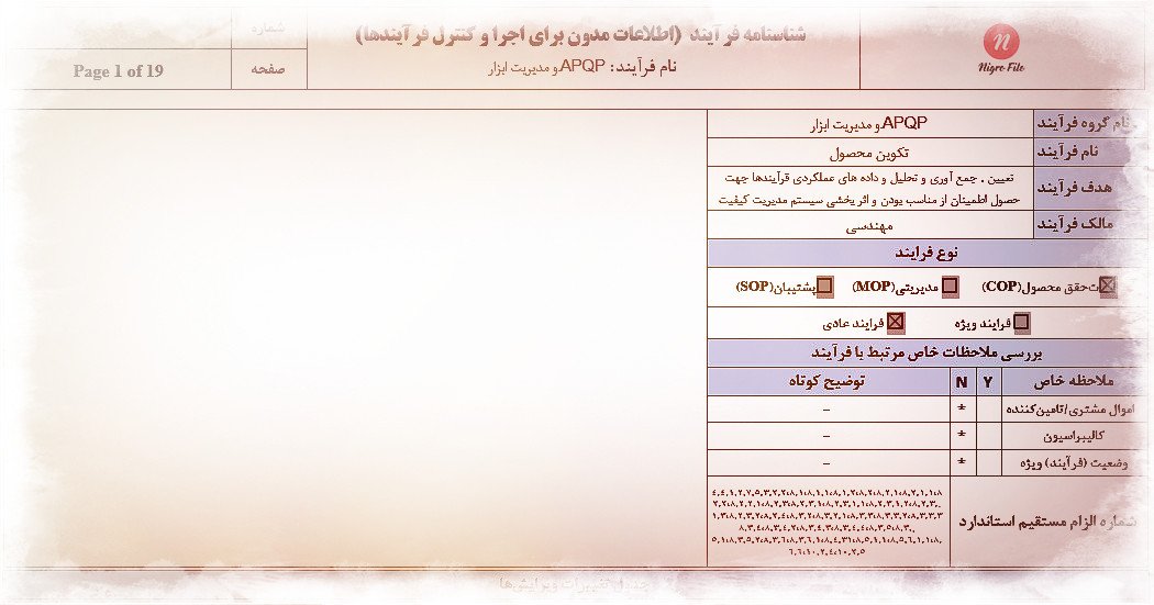 ۱-نمونه شناسنامه فرآیند برای طرح ریزی پیشاپیش کیفیت محصول (APQP)