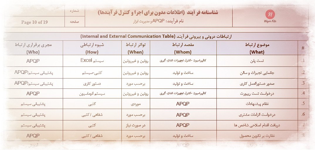 – ارتباطات درونی و بیرونی فرآیند (Internal and External Communication Table)