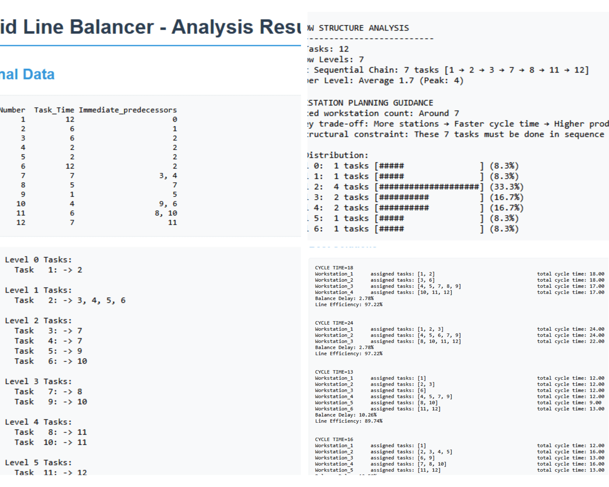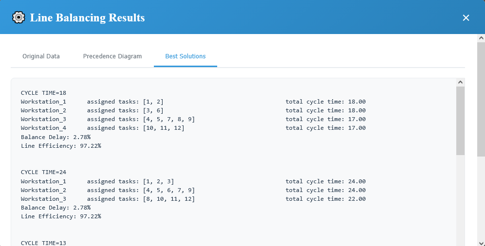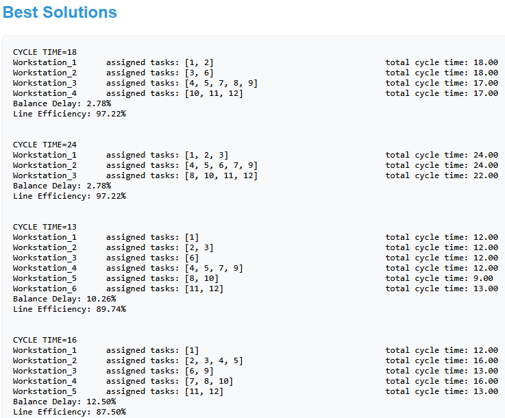 رتبه سوم در این فهرست با زمان سیکل ۱۳ واحد زمانی و تعداد ۶ ایستگاه کاری در واقع بهترین بالانس خط است. دقت داشته باشید که باید بین زمان بیکاری و راندمان بالا در کنار زمان سیکل یک مصالحه (Trade-off) داشته باشید. اگر تمام فعالیت ها را بخواهید در تعداد کمی از ایستگاه های کاری قرار دهید به طوریکه زمان بیکاری هر ایستگاه به حداقل برسد آنوقت زمان سیکل تولید زیادتری خواهید داشت. برای همین بهتر است بین تعداد ایستگاه های کاری، زمان سیکل تولید، راندمان خط و در نهایت زمان بیکاری یک تعادل برقرار کنید