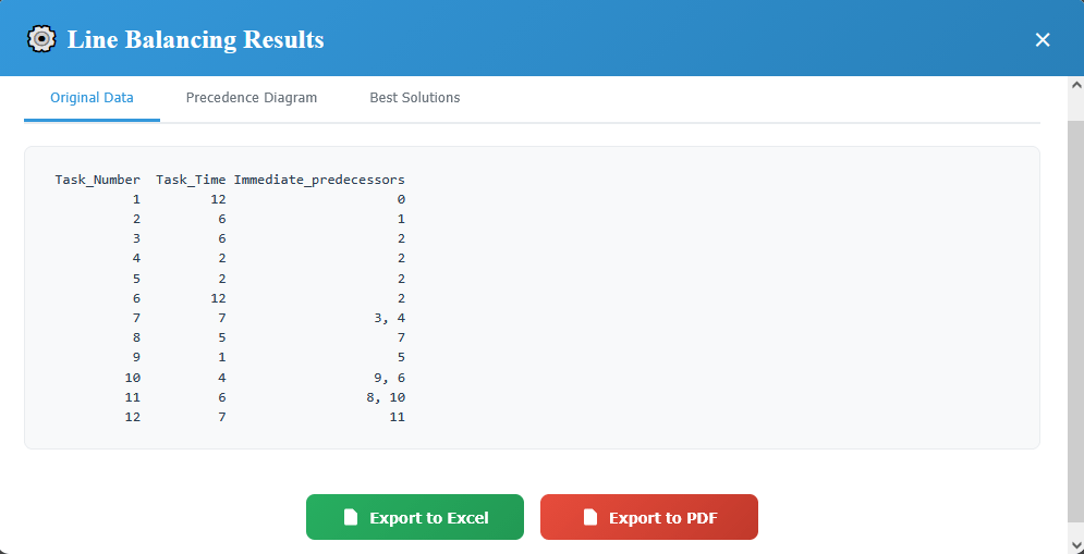 ۶. روی دکمه اجرای آنالیز کلیک کنید و بسته به تعداد فعایت ها می توانید بعد از اتمام آنالیز پنجره خروجی جواب را مشاهده کنید. پنجره خروجی شامل ۳ تب مجزا است است در تب Original Data داده های ورودی به نرم افزار را نشان می دهد. تب Precedence Diagram شامل روابط بین فعالیت ها و تحلیل های اضافی از جمله پیشنهاد انتخاب بهترین تعداد ایستگاه های کاری است (شکل شماره ۴).