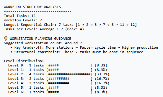 در تب Precedence Diagram برخی از تحلیل های آماری را مشاهده خواهد کرد از جمله قسمت مربوط به پیشنهاد انتخاب بهترین تعداد ایستگاه های کاری. ارزش دارد که برای تعیین روابط بین فعالیت ها به خصوص تعیین پیش نیازها، وقت بگذارید و با وسواس عمل کنید. هرچه در این مرحله دقت کنید در نهایت جواب دقیقتری دریافت خواهید کرد. برای مثال خروجی پیشنهاد برای داده های مثالی که ما در اینجا استفاده کردیم به شرح زیر است: