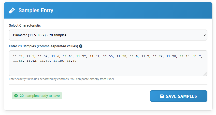 ۷. همزمان با وارد کردن اولین مشخصه، قسمت مربوط به وارد کردن نمونه ها (Samples Entry) نمایش داده می شود. اول از لیست کشویی Select Characteristic نام مشخصه مورد نظر خود را انتخاب کنید و بعد در قسمت Enter Samples نمونه های خود را وارد کنید. توجه داشته باشید که بین هر اندازه از علامت کاما استفاده کنید.